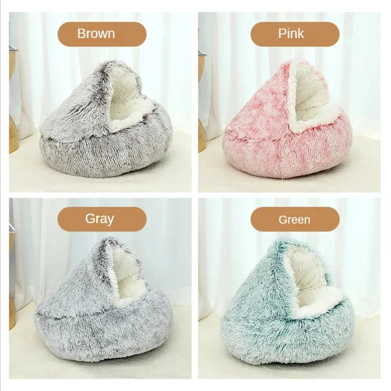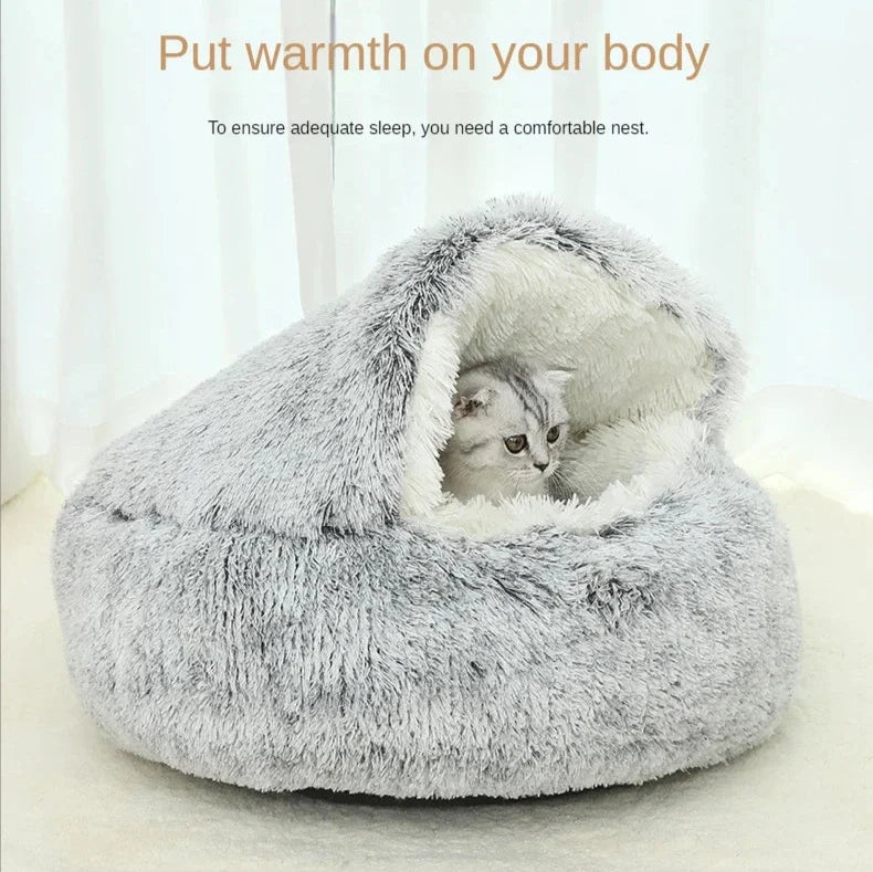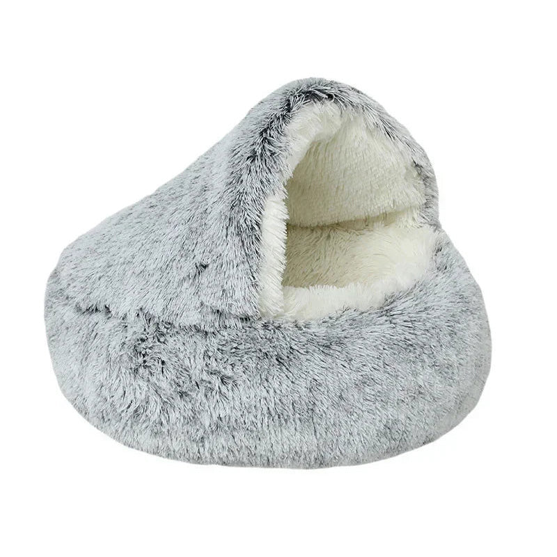 CozyNest™ features long plush fabric and a cozy round shape, which is designed with the pet's comfort in mind. With its 2-in-1 design, it can function as both a covered sleeping bag for extra warmth or a traditional open bed. Available in various sizes and colors, this bed creates a calming and self-warming environment that’s perfect for small dogs and cats.